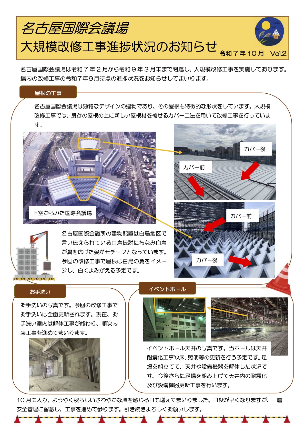 2025.10.07(火) お知らせ PDF版のダウンロードはコチラ 最新号含めたバックナンバーはコチラから 名古屋国際会議場 大規模改修工事進捗状況のお知らせ(2025年9月Vol.1) 名古屋国際会議場 大規模改修工事進捗状況のお知らせ(2025年10月Vol.2)