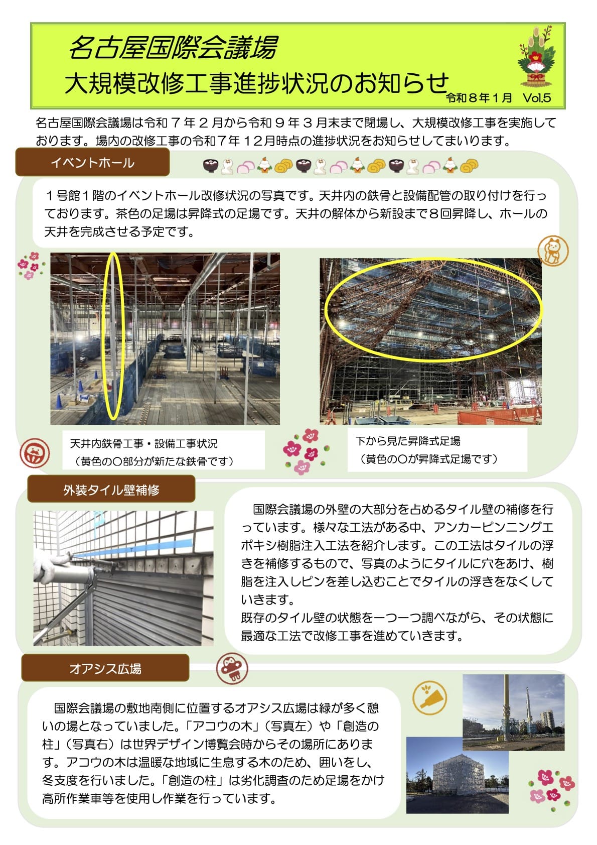2026.01.15(木) お知らせ PDF版のダウンロードはコチラ 最新号含めたバックナンバーはコチラから 名古屋国際会議場 大規模改修工事進捗状況のお知らせ(2025年9月Vol.1) 名古屋国際会議場 大規模改修工事進捗状況のお知らせ(2025年10月Vol.2) 名古屋国際会議場 大規模改修工事進捗状況のお知らせ(2025年11月Vol.3) 名古屋国際会議場 大規模改修工事進捗状況のお知らせ(2025年12月Vol.4) 名古屋国際会議場 大規模改修工事進捗状況のお知らせ(2026年1月Vol.5)